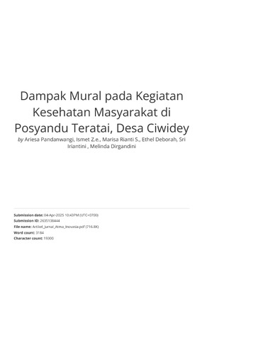 Pandanwangi, Ariesa and Effendi, Ismet Zainal and Sutanto, Marisa Rianti and Deborah, Ethel and Iriantini, Sri and Dirgandini, Melinda and Ratnadewi, Ratnadewi (2025) Dampak Mural pada Kegiatan Kesehatan Masyarakat di Posyandu Teratai, Desa Ciwidey. Jurnal Atma Inovasia (JAI), 5 (2). pp. 88-93. ISSN 2775-9113
