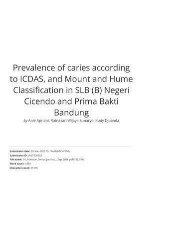Apriani, Anie and Sunaryo, Ratnasari Wijaya and Djuanda, Rudy (2024) Prevalence of caries according to ICDAS, and Mount and Hume Classification in SLB (B) Negeri Cicendo and Prima Bakti Bandung. Makassar Dental Journal, 13 (1). pp. 157-161. ISSN 2089-8134