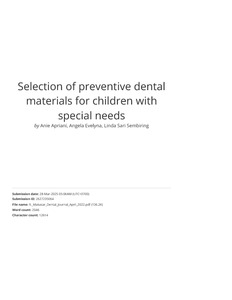 Apriani, Anie and Evelyna, Angela and Sembiring, Linda Sari (2022) Selection of preventive dental materials for children with special needs. Makassar Dental Journal, 11 (1). pp. 48-50. ISSN 2089-8134