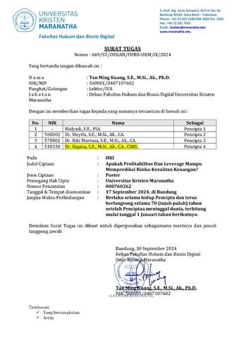Universitas Kristen Maranatha, Mulyadi, Meythi, Riki Martusa, Rapina (2024) Apakah Profitabilitas Dan Leverage Mampu Memprediksi Risiko Kesulitan Keuangan? 000760262.