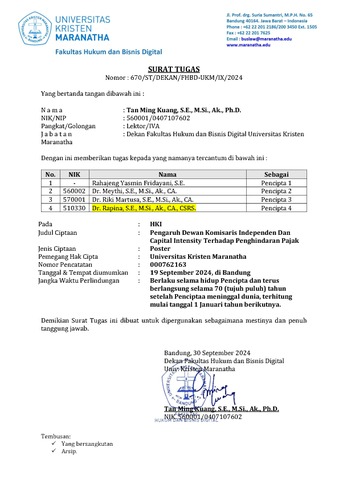Universitas Kristen Maranatha, Rahajeng Yasmin Fridayani, Meythi, Riki Martusa, Rapina (2024) Pengaruh Dewan Komisaris Independen Dan Capital Intensity Terhadap Penghindaran Pajak. 000762163.