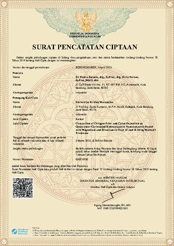 Universitas Kristen Maranatha, Dahlia Sutanto, Silvia Naliani, Teresa Lucretia Maria Astari (2025) Comparison of Collagen Fiber and Callus Deposition on Geopolymer-Carbonated Hydroxyapatite Nanocomposite Doped with Magnesium and Strontium on Days 14 and 28 Using Masson’s Trichrome. 000876950.