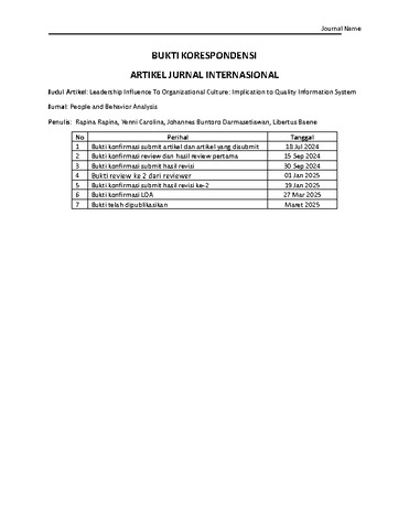 Rapina, Rapina and Carolina, Yenni and Darmasetiawan, Johannes Buntoro and Baene, Libertus (2025) Leadership Influence To Organizational Culture: Implication to Quality Information System. People and Behavior Analysis, 3 (1). pp. 92-106. ISSN 2986-9803