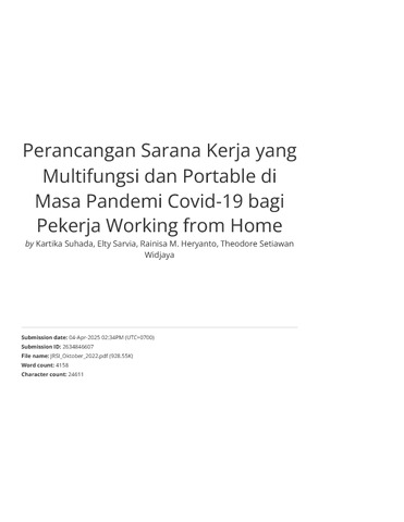 Suhada, Kartika and Sarvia, Elty and Heryanto, Rainisa Maini and Widjaya, Theodore Setiawan (2022) Perancangan Sarana Kerja yang Multifungsi dan Portable di Masa Pandemi Covid-19 bagi Pekerja Working from Home. Jurnal Rekayasa Sistem Industri, 11 (2). pp. 181-190. ISSN 2339-1499
