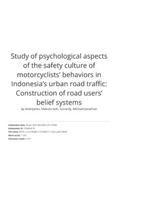 Andrijanto, Andrijanto and Itoh, Makoto and Sunardy, Sunardy and Jonathan, Michael (2025) Study of psychological aspects of the safety culture of motorcyclists’ behaviors in Indonesia’s urban road traffic: Construction of road users’ belief systems. IATSS Research, 49. pp. 137-154.