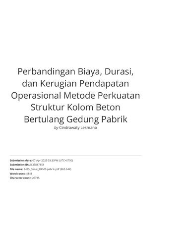Perbandingan Biaya, Durasi, dan Kerugian Pendapatan Operasional Metode Perkuatan Struktur Kolom Beton Bertulang Gedung Pabrik.pdf Download (3291Kb) | Preview |