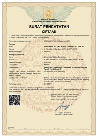 Universitas Kristen Maranatha, Winda Halim, Wawan Yudiantyo, Novi, Elty Sarvia, Martin (2022) Desain Tata Letak Rumah Penginapan di Kampung Stamplat Rumah Tipe 30 Model D. 000423570.
