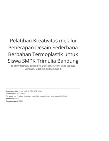 Suhanjoyo, Shirly Nathania and Aryani, Dewi Isma and Gunawan, Irena Vanessa and Wianto, Elizabeth and Royandi, Yudita (2023) Pelatihan Kreativitas melalui Penerapan Desain Sederhana Berbahan Termoplastik untuk Siswa SMPK Trimulia Bandung. Jurnal ABDINUS : Jurnal Pengabdian Nusantara, 7 (2). pp. 435-443. ISSN 2599-0764