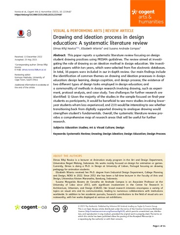 Novica, Dimas Rifqi and Wianto, Elizabeth and Campos, Susana Andrade (2023) Drawing and ideation process in design education: A systematic literature review. Cogent Arts & Humanities, 10 (1). ISSN 2331-1983