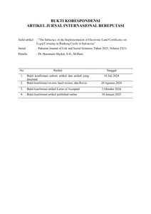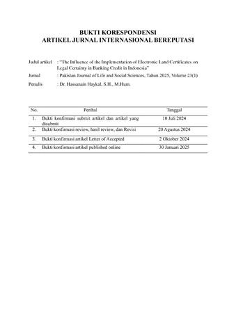 Haykal, Hassanain The Influence of the Implementation of Electronic Land Certificates on Legal Certainty in Banking Credit in Indonesia. Pakistan Journal of Life and Social Sciences, 23 (1). pp. 3980-3988. ISSN 2221-7630