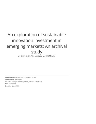 SeTin, SeTin and Martusa, Riki and Meythi, Meythi (2024) An Exploration of Sustainable Innovation Investment in Emerging Markets: An Archival Study. International Journal of Management and Sustainability, 13 (4). pp. 963-975. ISSN 2306-0662