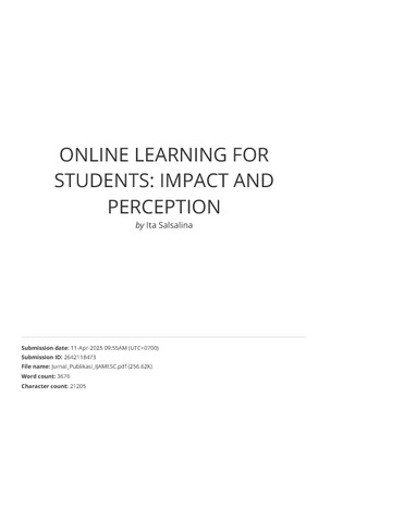 Hidayat, Vinny Stephanie and Lingga, Ita Salsalina and Jovi, Christian (2024) Online Learning for Students: Impact and Perception. International Journal of Accounting, Management, and Economics and Social Sciences (IJAMESC), 2 (5). pp. 1905-1912. ISSN 2986-8645