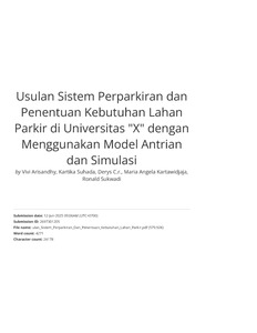 Penelitian mengenai sistem perparkiran dan sistem antrian telah banyak dilakukan sebelumnya. Namun penelitian yang membahas sistem perparkiran yang berpengaruh ke sistem antrian dan perhitungan kebutuhan lahan parkir belum banyak dilakukan. Panjangnya antrian mobil di depan Gerbang 2 Universitas “X” banyak dikeluhkan mahasiswa dan mengganggu kelancaran arus lalu lintas depan kampus. Oleh karena itu, akan diusulkan sistem perparkiran dan penentuan kebutuhan lahan parkir di universitas tersebut. Langkah pertama yang dilakukan adalah pengujian kesamaan rata-rata untuk laju kedatangan mobil dan lama waktu parkir antar rentang waktu dan antar hari dengan SPSS. Selanjutnya dilakukan penentuan distribusi laju kedatangan mobil dan lama waktu parkir, lama waktu pelayanan manless dan loket keluar dengan Stat Fit. Kemudian dibuat model simulasi sistem antrian saat ini dan usulan dengan program Promodel. Dengan melakukan perubahan lokasi pintu masuk, posisi manless dan loket operator keluar, terjadi penurunan lama waktu menunggu sebesar 95,88% di manless Gedung A, 42,31% di manless Gedung B, 79,40% di drop-off point dan panjang antrian maksimum di depan gerbang masuk menurun sebesar 91,40%. Kebutuhan maksimum lahan parkir Gedung B adalah 394 mobil. Dengan diijinkannya parkir paralel, lahan parkir dapat menampung 392 mobil. Oleh karena kekurangan lahan hanya sebesar 2 mobil, maka lahan parkir Gedung B yang ada saat ini masih mencukupi kebutuhan.
