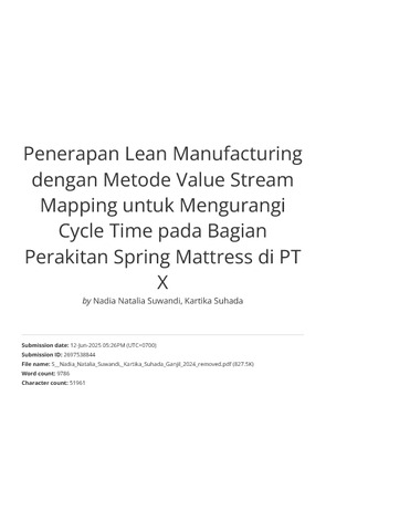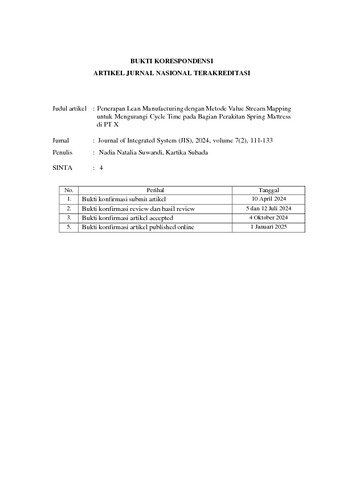 Suwandi, Nadia Natalia and Suhada, Kartika (2024) Penerapan Lean Manufacturing dengan Metode Value Stream Mapping untuk Mengurangi Cycle Time pada Bagian Perakitan Spring Mattress di PT X. Journal of Integrated System, 7 (2). pp. 111-133. ISSN 2621-7104