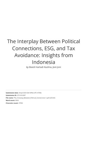 Kuslina, Boedi Hartadi and Joni, Joni (2025) The Interplay Between Political Connections, ESG, and Tax Avoidance: Insights from Indonesia. In: The 33rd Annual Conference on Pacific Basin Finance, Economics, Accounting and Management, June 13-14, 2025, Taiwan.