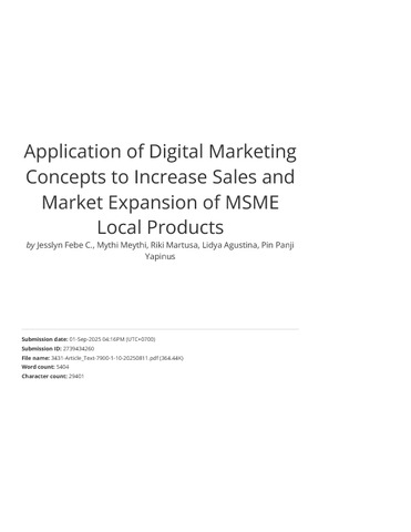 Christiane, Jesslyn Febe and Meythi, Meythi and Martusa, Riki and Agustina, Lidya and Yapinus, Pin Panji (2025) Application of Digital Marketing Concepts to Increase Sales and Market Expansion of MSME Local Products. International Journal of Innovative Technologies in Economy (3). ISSN 2414-1305