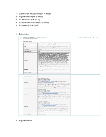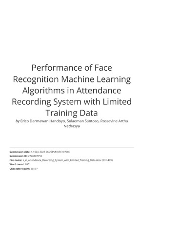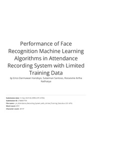 Handoyo, Erico Darmawan and Santoso, Sulaeman and Nathasya, Rossevine Artha (2025) Performance of Face Recognition Machine Learning Algorithms in Attendance Recording System with Limited Training Data. Journal of Innovative Image Processing, 7 (3). pp. 707-724. ISSN 2582-4252
