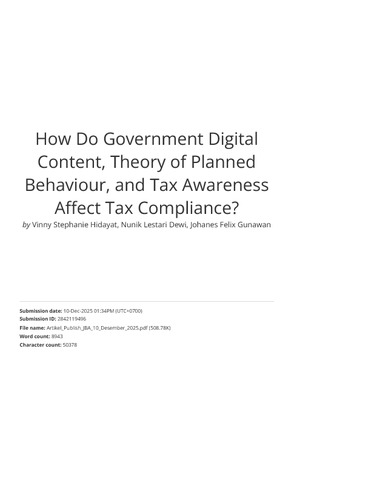 Hidayat, Vinny Stephanie and Dewi, Nunik Lestari and Gunawan, Johanes Felix (2025) How do Governmental Digital Content, Theory of Planned Behaviour, and Tax Awareness Affect Tax Compliance? Jurnal Bisnis dan Akuntansi, 27 (1). pp. 137-158. ISSN 2656 – 9124