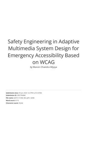 Wijaya, Marvin Chandra (2025) Safety Engineering in Adaptive Multimedia System Design for Emergency Accessibility Based on WCAG. International Journal of Electrical and Electronic Engineering and Telecommunications, 14 (6). pp. 382-389. ISSN 2319-2518