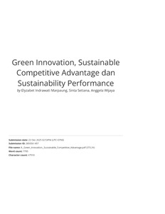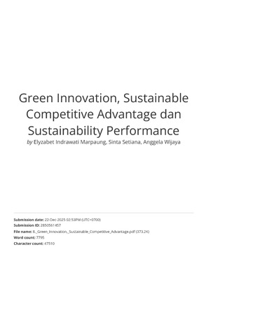 Marpaung, Elyzabet Indrawati and Setiana, Sinta and Wijaya, Anggela (2024) Green Innovation, Sustainable Competitive Advantage dan Sustainability Performance. Jurnal Akuntansi, Keuangan, Pajak dan Informasi (JAKPI), 4 (2). pp. 72-89. ISSN 2775-9792