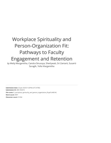Margaretha, Meily and Sinuraya, Candra and Sherlywati, Sherlywati and Zaniarti, Sri (2026) Workplace Spirituality and Person-Organization Fit: Pathways to Faculty Engagement and Retention. European Journal of Educational Research, 15 (1). pp. 65-78. ISSN 2165-8714
