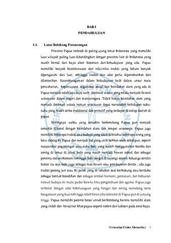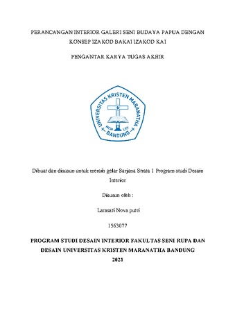 Putri, Larasati Nova (1563077) and Santoso, Miky Endro and Maximillian, Arnold (2021) Perancangan Interior Galeri Seni Budaya Papua Dengan Konsep Izakod Bakai Izakod Kai. Undergraduate thesis, Universitas Kristen Maranatha.