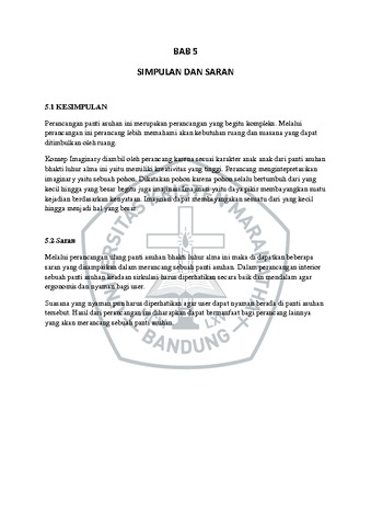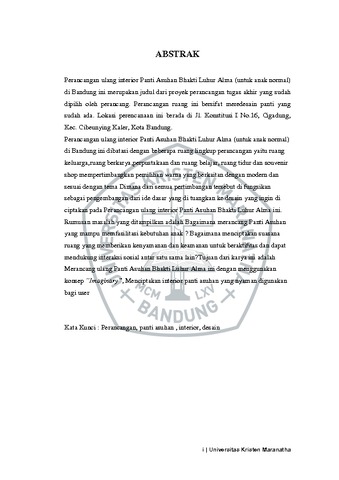 Perancangan ulang interior Panti Asuhan Bhakti Luhur Alma (untuk anak normal) di Bandung ini merupakan judul dari proyek perancangan tugas akhir yang sudah dipilih oleh perancang. Perancangan ruang ini bersifat meredesain panti yang sudah ada. Lokasi perencanaan ini berada di Jl. Konstitusi I No.16, Cigadung, Kec. Cibeunying Kaler, Kota Bandung. Perancangan ulang interior Panti Asuhan Bhakti Luhur Alma (untuk anak normal) di Bandung ini dibatasi dengan beberapa ruang lingkup perancangan yaitu ruang keluarga,ruang berkarya,perpustakaan dan ruang belajar, ruang tidur dan souvenir shop mempertimbangkan pemilihan warna yang berkaitan dengan modern dan sesuai dengan tema Dimana dari semua pertimbangan tersebut di fungsikan sebagai pengembangan dari ide dasar yang di tuangkan ke desain yang ingin di ciptakan pada Perancangan ulang interior Panti Asuhan Bhakti Luhur Alma ini. Rumusan masalah yang ditampilkan adalah Bagaimana merancang Panti Asuhan yang mampu memfasilitasi kebutuhan anak ? Bagaimana menciptakan suasana ruang yang memberikan kenyamanan dan keamanan untuk beraktifitas dan dapat mendukung interaksi sosial antar satu sama lain?Tujuan dari karya ini adalah Merancang ulang Panti Asuhan Bhakti Luhur Alma ini dengan menggunakan konsep “Imaginary”, Menciptakan interior panti asuhan yang nyaman digunakan bagi user