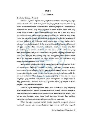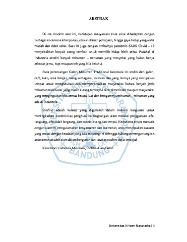 Di era modern saat ini, kehidupan masyarakat kota terus dihadapkan dengan berbagai ancaman akibat polusi, stress tekanan pekerjaan, hingga gaya hidup yang serba mudah dan tidak sehat. Saat ini juga dengan timbulnya pandemic SARS Covid – 19 menyebabkan banyak orang kembali untuk memilih hidup lebih sehat. Padahal di Indonesia sendiri banyak minuman – minuman yang menyehat yang bukan hanya sekedar jamu, kopi maupun teh yang kita ketahui. Pada perancangan Galeri Minuman Traditional Indonesia ini terdiri dari galeri, café, toko, area belajar, ruang serbaguna, restoran dan yang lainnya yang merupakan tempat untuk mengedukasi dan memperkenalkan masyarakat bahwa banyak jenis minuman traditional yang masih kurang terekspos oleh pemerintah maupun masyarakat yang mengingatkan kita semua betapa luas dan beragamnya minuman – minuman yang ada di Indonesia. Biofilic adalah konsep yang digunakan dalam industri bangunan untuk meningkatkan konektivitas penghuni ke lingkungan alam melalui penggunaan sifat langsung, sifat tidak langsung, dan kondisi ruang dan tempat. Kerjasama antara manusia dengan alam ini mengutamakan kenyamanan dan keamanan, serta menciptakan suasana yang sesuai dengan keadaan yang ada sekarang ini sehingga hubungan menguntungkan antara manusia dan alam dalam bangunan dan lanskap modern dapat terwujud.