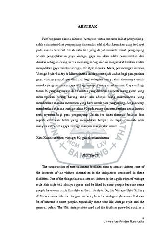 Pembangunan sarana hiburan bertujuan untuk menarik minat pengunjung, salah satu minat dari pengunjung itu sendiri adalah dari keunikan yang terdapat pada sarana tersebut. Salah satu hal yang dapat menarik minat pengunjung adalah pengaplikasian gaya vintage, gaya ini akan selalu bermunculan dan disukai sebagian orang karna memang sebagian dari masyarakat bahkan sudah menjadikan gaya tersebut sebagai life style mereka. Maka, perancangan interior Vintage Style Gallery & Microcinema ini dapat menjadi wadah bagi para pecinta gaya vintage yang dapat diminati bagi sebagian masyarakat khususnya untuk mereka yang menyukai gaya vintage maupun masyarakat umum. Gaya vintage tahun 80 yang digunakan dan fasilitas yang diberikan seperti ruang galeri yang menampilkan barang barang antik lalu adanya ruang mikrosinema yang memberikan suasana menonton yang baru untuk para pengunjung, dengan tetap memberikan suasana vintage tahun 80 pada ruang dan memberikan kesan homey serta nyaman bagi para pengunjung. Selain itu disediakannya fasilitas lain seperti café dan butik yang menjadikan tempat ini dapat diminati oleh masyarakat pecinta gaya vintage maupun masyarakat umum.