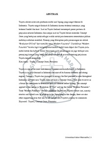 Toyota adalah salah satu produsen mobil asal Jepang yang sangat dikenal di Indonesia. Toyota sangat diminati di Indonesia karena terkenal mesinnya yang terkenal bandel dan kuat. Saat ini Toyota berhasil menempati posisi pertama di penjualan seluruh Indonesia dan sampai saat ini Toyota belum memiliki Concept Store yang bertujuan untuk sebagai wadah untuk para konsumen menentukan pilihan mobilnya sebelum membeli. Konsep yang diterapkan pada perancangan ini adalah “Evolution Of Oval” dan memiliki tema “Modern Futuristic”. Diambilnya “Modern Futuristic” karena ingin mengimplementasikan mobil masa depan dari Toyota yaitu mobil listrik dan hybrid. Selain Showroom pada perancangan ini juga terdapat area penunjang lainnya yang bertujuan untuk menambah wawasan tentang perjalanan Toyota kepada konsumen.