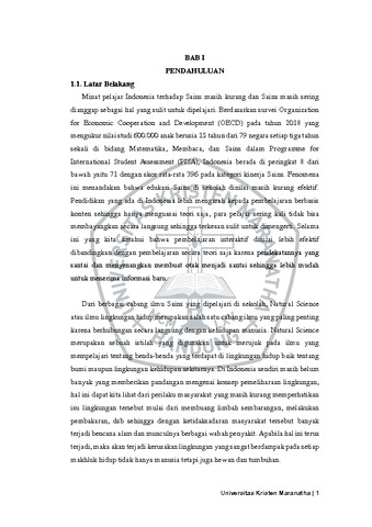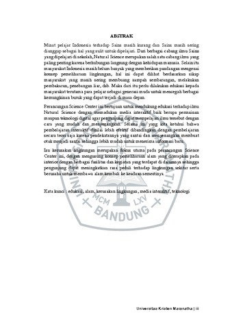 Minat pelajar Indonesia terhadap Sains masih kurang dan Sains masih sering dianggap sebagai hal yang sulit untuk dipelajari. Dari berbagai cabang ilmu Sains yang dipelajari di sekolah, Natural Science merupakan salah satu cabang ilmu yang paling penting karena berhubungan langsung dengan kehidupan manusia. Selain itu masyarakat Indonesia masih belum banyak yang memberikan pandangan mengenai konsep pemeliharaan lingkungan, hal ini dapat dilihat berdasarkan sikap masyarakat yang masih sering membuang sampah sembarangan, melakukan pembakaran, penebangan liar, dsb. Maka dari itu perlu dilakukan edukasi kepada masyarakat terutama para pelajar sebagai generasi muda untuk mencegah berbagai kemungkinan buruk yang dapat terjadi di masa depan. Perancangan Science Center ini bertujuan untuk mendukung edukasi terhadap ilmu Natural Science dengan memadukan media interaktif baik berupa permainan maupun teknologi digital agar pengunjung dapat mempelajari ilmu tersebut dengan cara yang mudah dan menyenangkan. Selama ini yang kita ketahui bahwa pembelajaran interaktif dinilai lebih efektif dibandingkan dengan pembelajaran secara teori saja karena pendekatannya yang santai dan menyenangkan membuat otak menjadi santai sehingga lebih mudah untuk menerima informasi baru. Isu kerusakan lingkungan merupakan fokus utama pada perancangan Science Center ini, dengan mengusung konsep pemeliharaan alam yang diterapkan pada interior dengan berbagai fasilitas dan kegiatan yang terdapat di dalamnya sehingga pengunjung dapat meningkatkan rasa peduli terhadap lingkungan sekitar serta berusaha untuk membawa alam kembali ke keadaan semestinya.