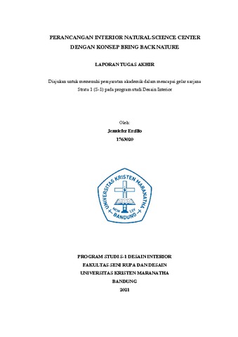 Ersilio, Jenniefer (1763020) (2021) Perancangan Interior Natural Science Center dengan Konsep Bring Back Nature. Undergraduate thesis, Universitas Kristen Maranatha.