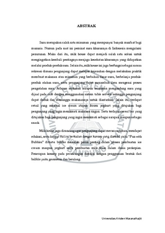 Susu merupakan salah satu minuman yang mempunyai banyak manfaat bagi manusia. Namun pada saat ini peminat susu khususnya di Indonesia mengalami penurunan. Maka dari itu, milk house dapat menjadi salah satu solusi untuk mengingatkan kembali pentingnya menjaga kesehatan khususnya yang didapatkan melalui produk-produk susu. Selain itu, milk house ini juga berfungsi sebagai sarana rekreasi dimana pengunjung dapat melepas kejenuhan dengan melakukan praktik membuat makanan atau minuman yang berbahan dasar susu, berbelanja produkproduk olahan susu, serta pengunjung dapat menambah ilmu mengenai proses pengolahan susu. Adapun makanan maupun minuman mengandung susu yang dijual pada café dengan menggunakan sistem table service sehingga pengunjung dapat duduk dan menunggu makanannya untuk diantarkan. Selain itu, terdapat retail yang menjual ice cream atupun frozen yoghurt yang ditujukan bagi pengunjung yang ingin menikmati makanan ringan. Serta terdapat cereal bar yang ditujukan bagi pengunjung yang ingin menikmati sebagai sarapan maupun sebagai snack. Milk house juga dirancang agar pengunjung dapat merasa nyaman, mendapat edukasi, serta happy. Hal ini berkaitan dengan konsep yang diambil yaitu “Fun with Bubbles” dimana bubble memiliki peran penting dalam proses pembuatan ice cream maupun yoghurt serta pembuatan milk foam dalam dunia perkopian. Penerapan konsep pada perancangan dimulai dengan penggunaan bentuk dari bubble yaitu geometris dan berulang.