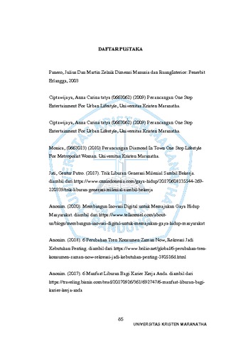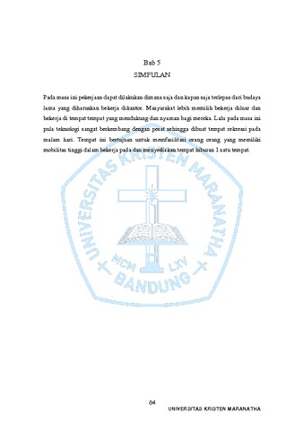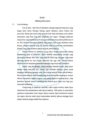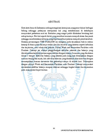 iii UNIVERSITAS KRISTEN MARANATHA ABSTRAK Kota kota besar di Indonesia sedang mengalami kemajuan yang pesat dalam berbagai bidang sehingga perkejaan merupakan hal yang mendominasi di kehidupan masyarakat perkotaan saat ini. Rutinitas yang sangat padat dilakukan berulang kali setiap harinya. Hal-hal seperti itulah yang membuat manusia menjadi stress dan jenuh sehingga membutuhkan hiburan yang dapat membuat pikiran menjadi jernih kembali. Konsep perancangan THE DUALISM ini mengacu pada keyakinan bahwa semua konsep di dunia pada dasarnya terdiri dari dua kualitas yang kontras seperti kebaikan dan kejahatan, atau tubuh dan pikiran. Dalam Work and Recreation Facilities with Dualism Concept ini adanya penggabungan aktivitas rekreasi dan bekerja yang direalisasikan kedalam perancangan interior dengan adanya 2 suasana yang disatukan dalam 1 tempat. Aktivitas bekerja yang identik pada siang hari ditampilkan dengan suasana tenang dan sejuk, lalu aktivitas bermain yang dinikmati di malam hari dengan menampilkan suasana keramain dan gemerlap cahaya di malam hari. Diharapkan dengan adanya Work and Recreation Facilities with Dualism Concept masyarakat melakukan aktifitas bekerja maupun rekreasi sehingga tingkat stress dan kejenuhan pada masyarakat dapat teratasi.
