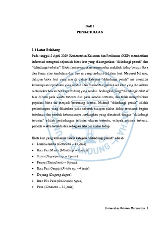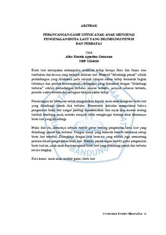 Biota laut merupakan sekumpulan makhluk hidup berupa flora dan fauna atau tumbuhan dan hewan yang terdapat didalam laut. Maksud “dilindungi penuh” adalah perlindungan yang dilakukan pada seluruh tahapan siklus hidup termasuk bagian tubuhnya dan produk keturunannya, sedangkan yang dimaksud dengan “dilindungi terbatas” adalah perlindungan terbatas ukuran tertentu, wilayah sebaran tertentu, periode waktu tertentu dan sebagian tahapan siklus hidup. Perancangan ini bertujuan untuk mengenalkan kepada anak-anak mengenai biota laut yang dilindungi penuh dan terbatas. Pemerintah kelautan mengatakan bahwa pengenalan biota laut sangat penting diperkenalkan dari sejak dini karena seiring tumbuh kembang anak, mereka menjadi lebih menghargai tentang alam khususnya biota laut yang dilindungi. Maka dari itu, dibuatnya sebuah mobile game tentang pengenalan biota laut yang dilindungi penuh dan terbatas. Dengan visual yang menarik beserta informasi setiap biota laut tersebut. Dilengkapi dengan cara bermain yang mudah juga menantang pemain dalam pengetahuan biota laut. Melalui perancangan mobile game pengenalan biota laut ini, anak-anak dapat mengenal biota laut yang dilindungi penuh dan terbatas secara lengkap.