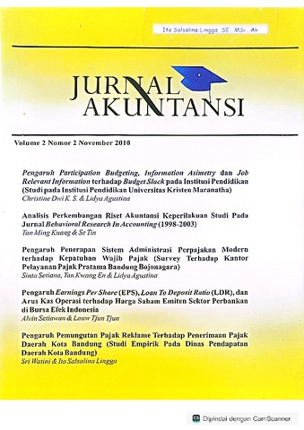 Watini, Sri and Lingga, Ita Salsalina (2010) Pengaruh Pemungutan Pajak Reklame TerhadapPenerimaan Pajak Daerah Kota Bandung (Studi Empirik Pada Dinas Pendapatan Daerah Kota Bandung). Jurnal Akuntansi, 2 (2). pp. 181-201.